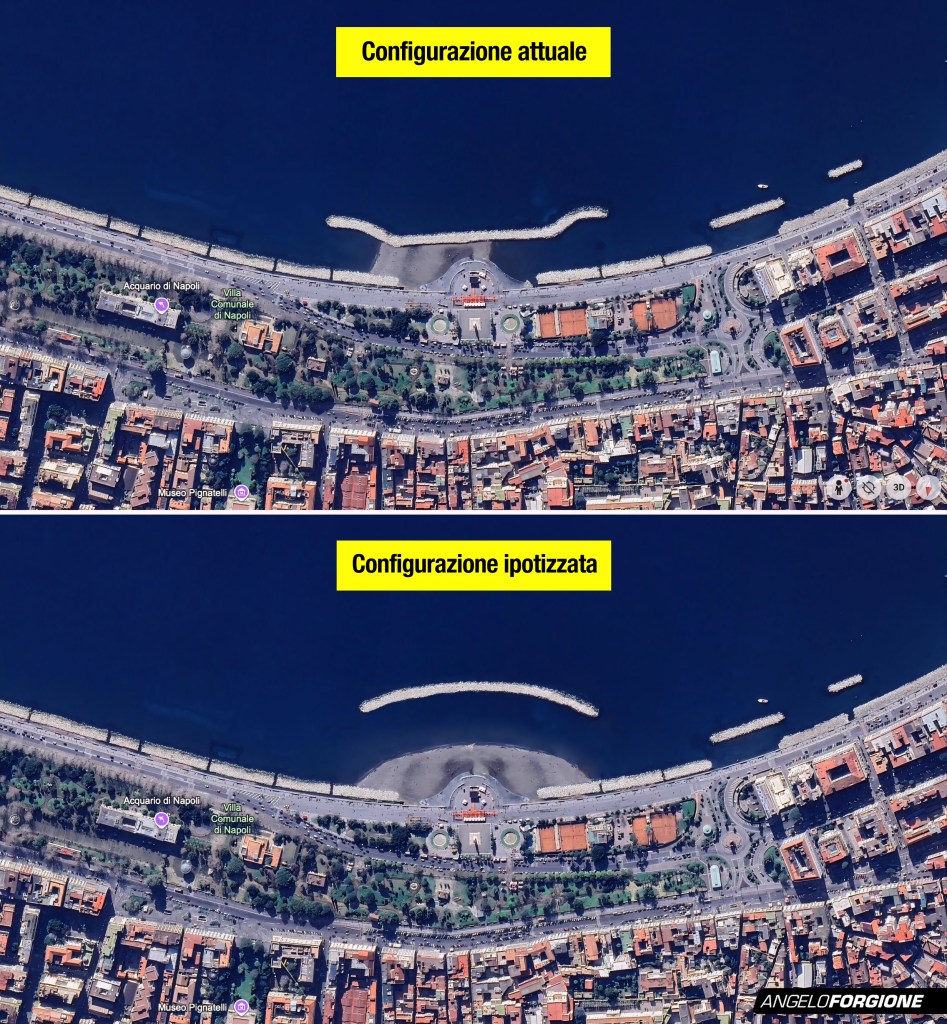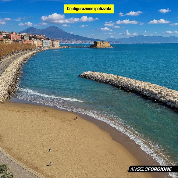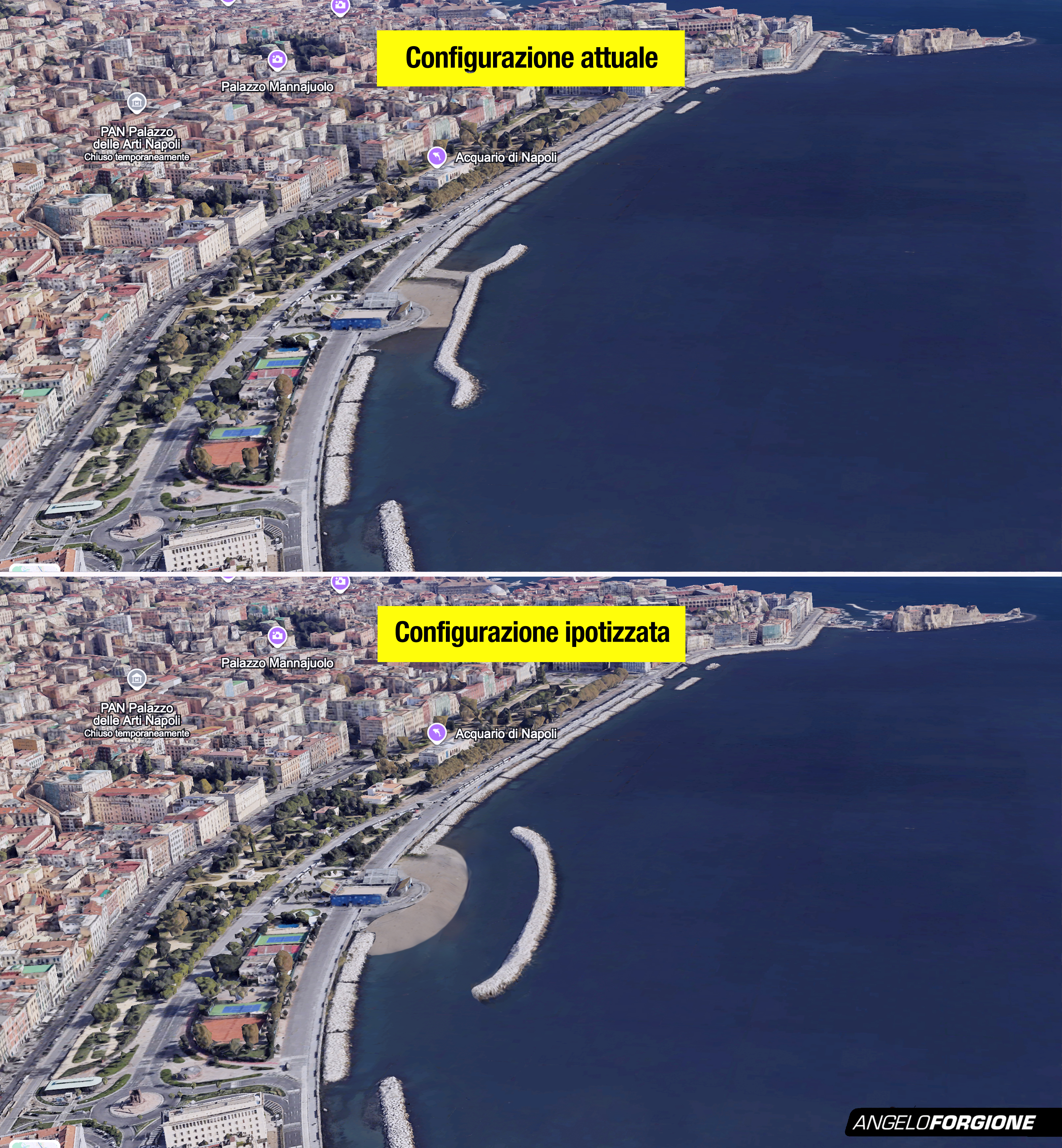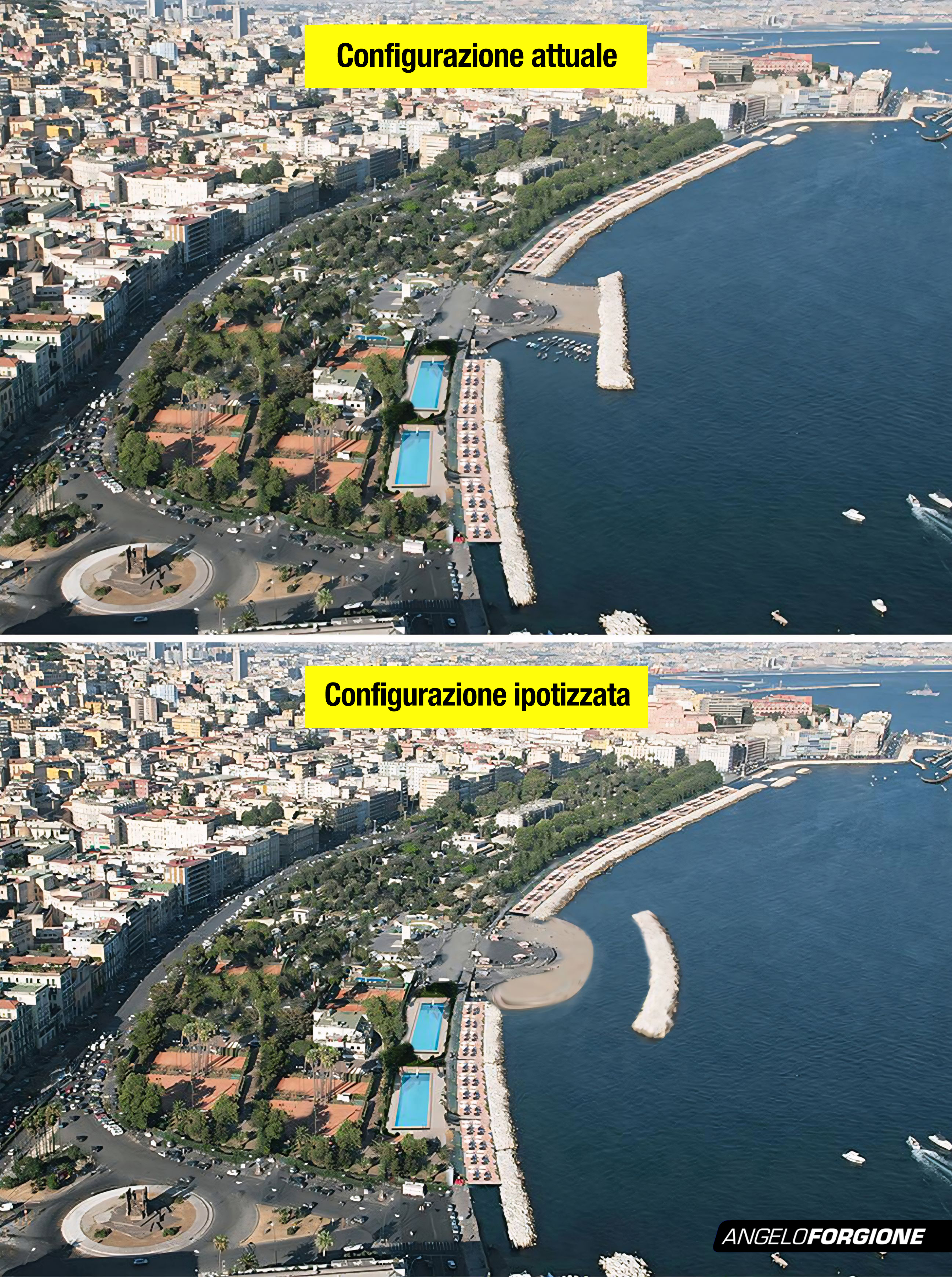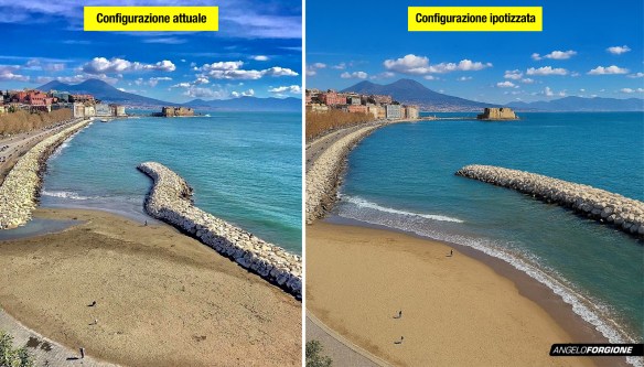 Ho dunque ipotizzato una risistemazione dell’arenile del “Lido Mappatella”, iconico e autentico spazio popolare di centro città, che attualmente presenta una configurazione inadeguata: la scogliera frangiflutti limita la fruizione a circa duecento metri di potenziale battigia, imponendo la balneazione sui versanti laterali della spiaggia, e rappresenta una sorta di muro che impedisce ai fruitori della spiaggia il godimento della vista panoramica sul Golfo, con Capri all’orizzonte e l’intera curva litoranea cittadina.[guarda video in basso]