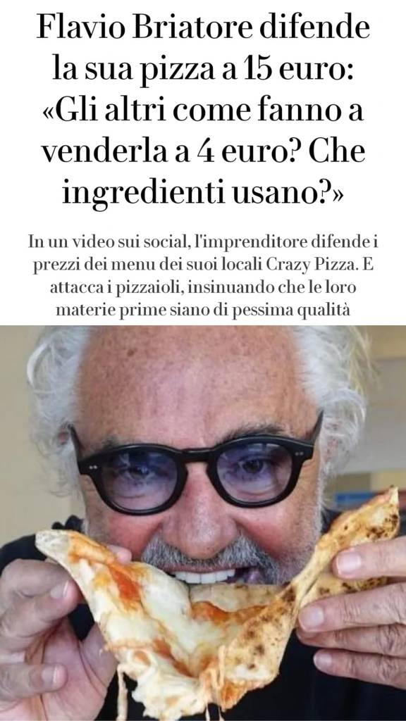 Il fatto è che Briatore non conosce neanche la storia della pietanza con cui fa soldi. Dice che non è vero che la pizza è di origine napoletana, e che, se lo è, gli altri l’hanno migliorata. Di certo non lui, che non usa lievito e fa la piadina aperta. Ma a chi permettiamo di parlare di arte dei pizzaiuoli napoletani Unesco? A un ignorante che fa da spalla a Cruciani. Suvvia!