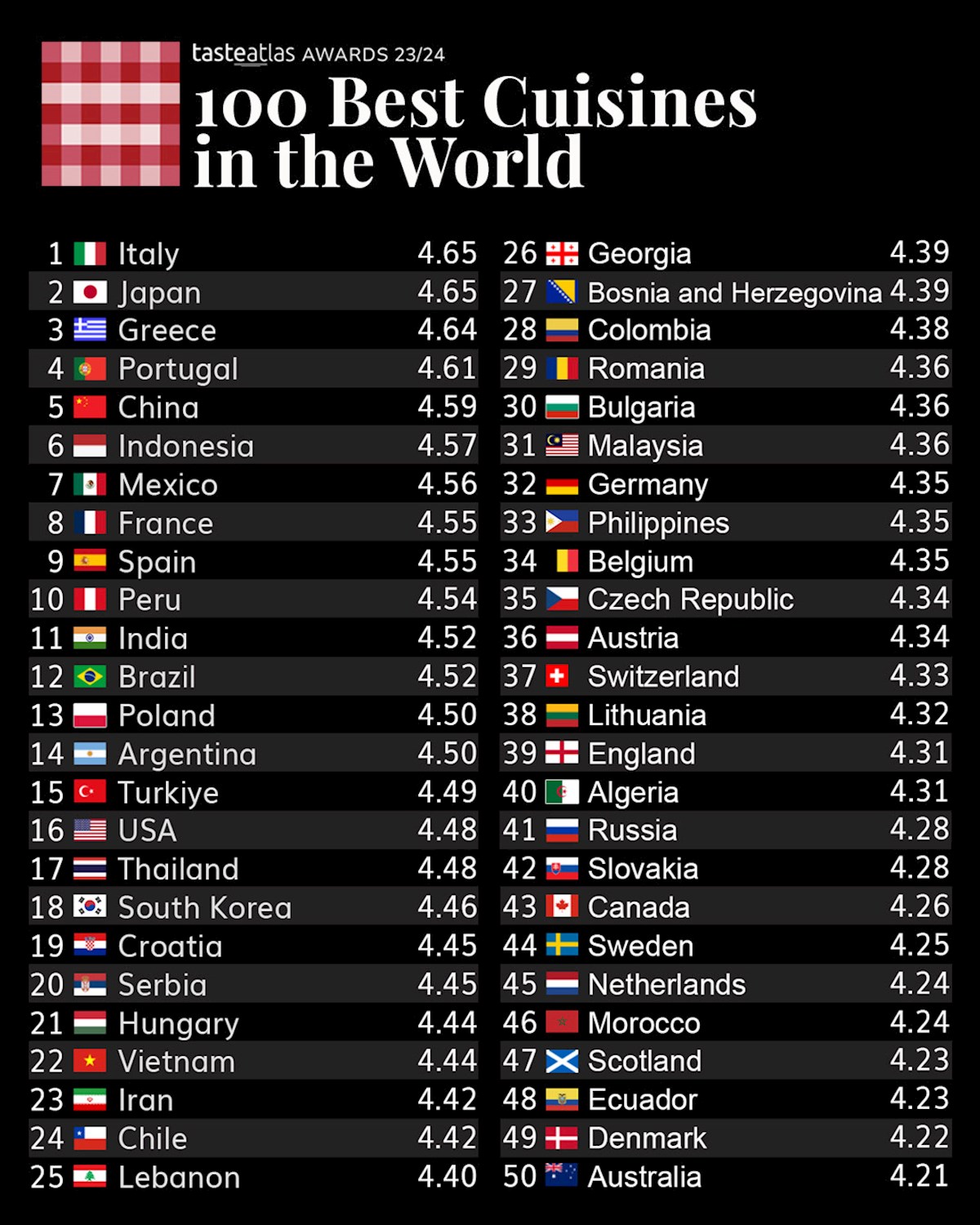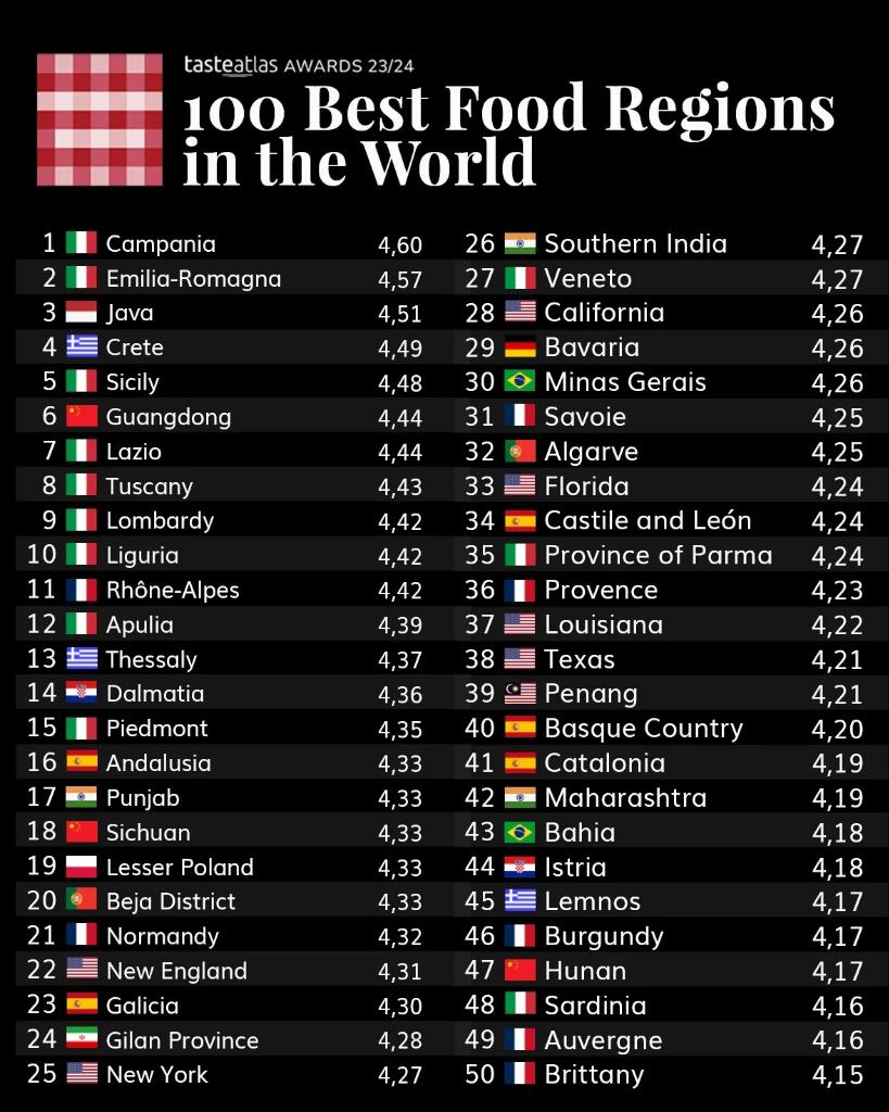 Angelo Forgione — La Cucina italiana è la migliore al mondo insieme a quella giapponese. E in testa al Globo svetta la cucina regionale della Campania, davanti a quella dell’Emilia Romagna. Parola degli awards 2023/24 di TasteAtlas, l’autorevole Atlante del Gusto dedicato alla catalogazione e alla promozione dei prodotti locali, delle ricette tradizionali e dei ristoranti tipici di tutti i continenti. Italia e Giappone hanno fatto registrare lo stesso punteggio medio, davanti alla Grecia, ma anche quest’anno lo Stivale ha conquistato il primo posto grazie alla valutazione più alta del suo piatto più votato: la pizza! Ma la Campania non è solo la regione del piatto più diffuso nel mondo, e conquista la corona mondiale battendo la fortissima concorrenza delle altre regioni d’Italia, senza dubbio la nazione con più varietà sul pianeta Terra.