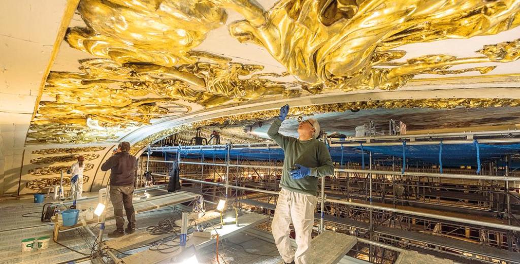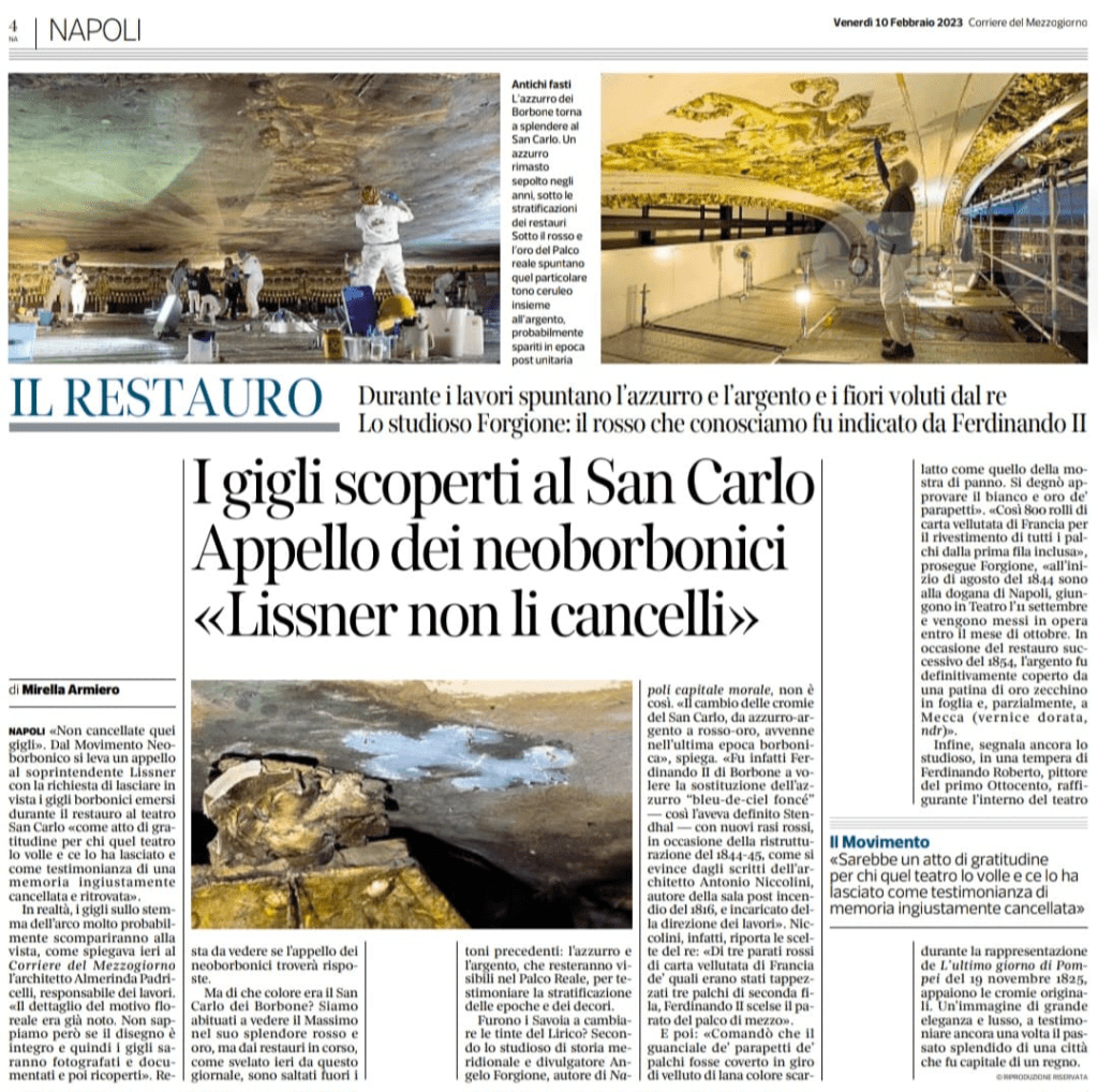 Angelo Forgione — Con il restauro interno in corso al Real Teatro di San Carlo di Napoli spuntano i colori originali (azzurro e argento brunito) della sala di Antonio Niccolini, non settecentesca ma inaugurata nel 1817, dopo l’incendio devastante dell’anno precedente e completamente diversa da quella del 1737, eccetto proprio i colori. Azzurro e argento brunito con riporti in oro sostituiti e coperti con rosso e solo oro per volontà di Ferdinando II tra il 1844 e il 1854, prima dell’avvento dei Savoia, come spiego al Corriere del Mezzogiorno (articolo), che aveva ipotizzato un’operazione d’epoca postunitaria. I colori rinvenuti resteranno visibili almeno sul palco reale. Prima del discusso restauro del 2008, il commissario straordinario Salvatore Natasi, l’architetto Elisabetta Fabbri e l’ex soprintendente speciale Nicola Spinosa considerarono l’opportunità di riportare tutta la sala ai colori originari, ma poi decisero di non procedere. Spuntati anche alcuni gigli borbonici sull’arco del boccascena, e il Movimento Neoborbonico chiede di tenerli in vista.