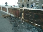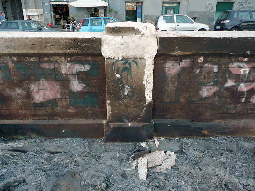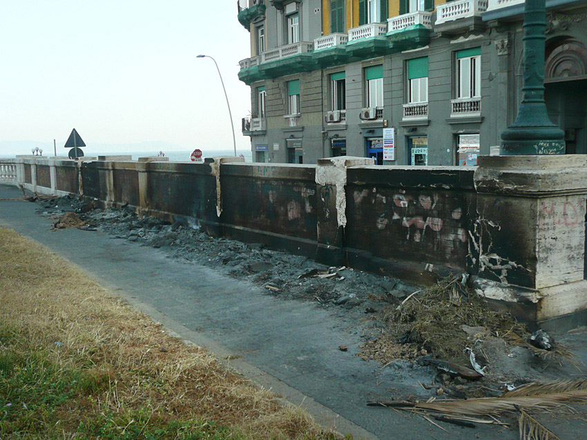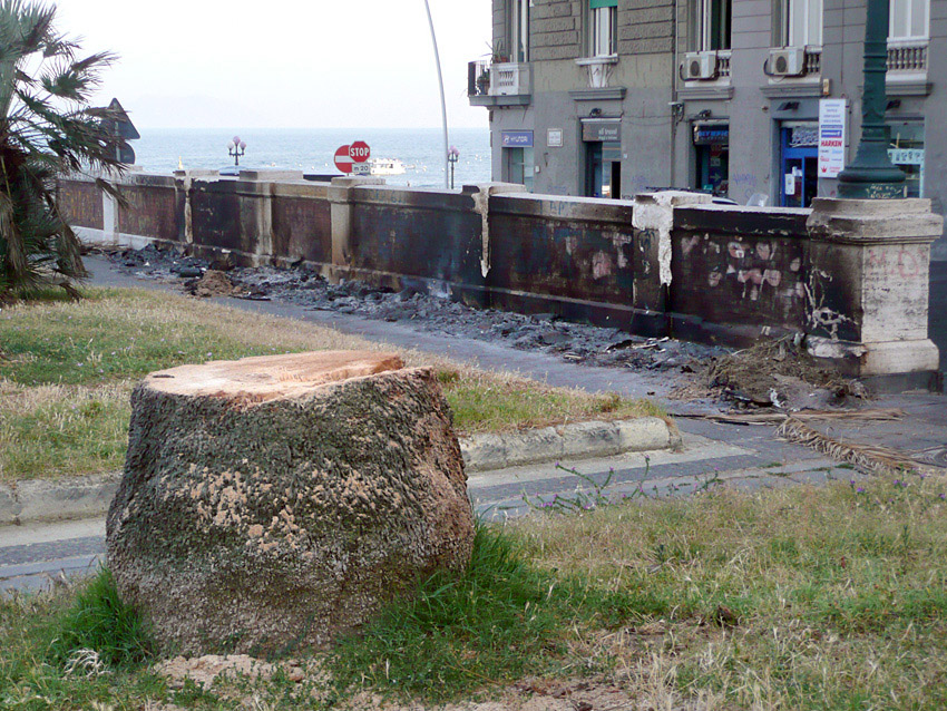 Ma mi è bastato girare lo sguardo sulla ormai martoriata balaustra di marmo che cinge l’area “verde” per notare il nuovo danno: i rami morti delle palme che le lodevoli persone del comitato pro De Magistris avevano sistemato da parte sotto la stessa recinzione, probabilmente infoltiti da altri recuperati dal taglio dei tronchi, sono stati dati alle fiamme per la solita bravata di chi non ha alcuna sensibilità e rispetto per la città. Il calore ha deturpato irrimediabilmente il marmo che, oltre ad annerirsi di fuliggine, si è frantumato lasciando evidenti frammenti a terra, tra i resti carbonizzati degli arbusti.
