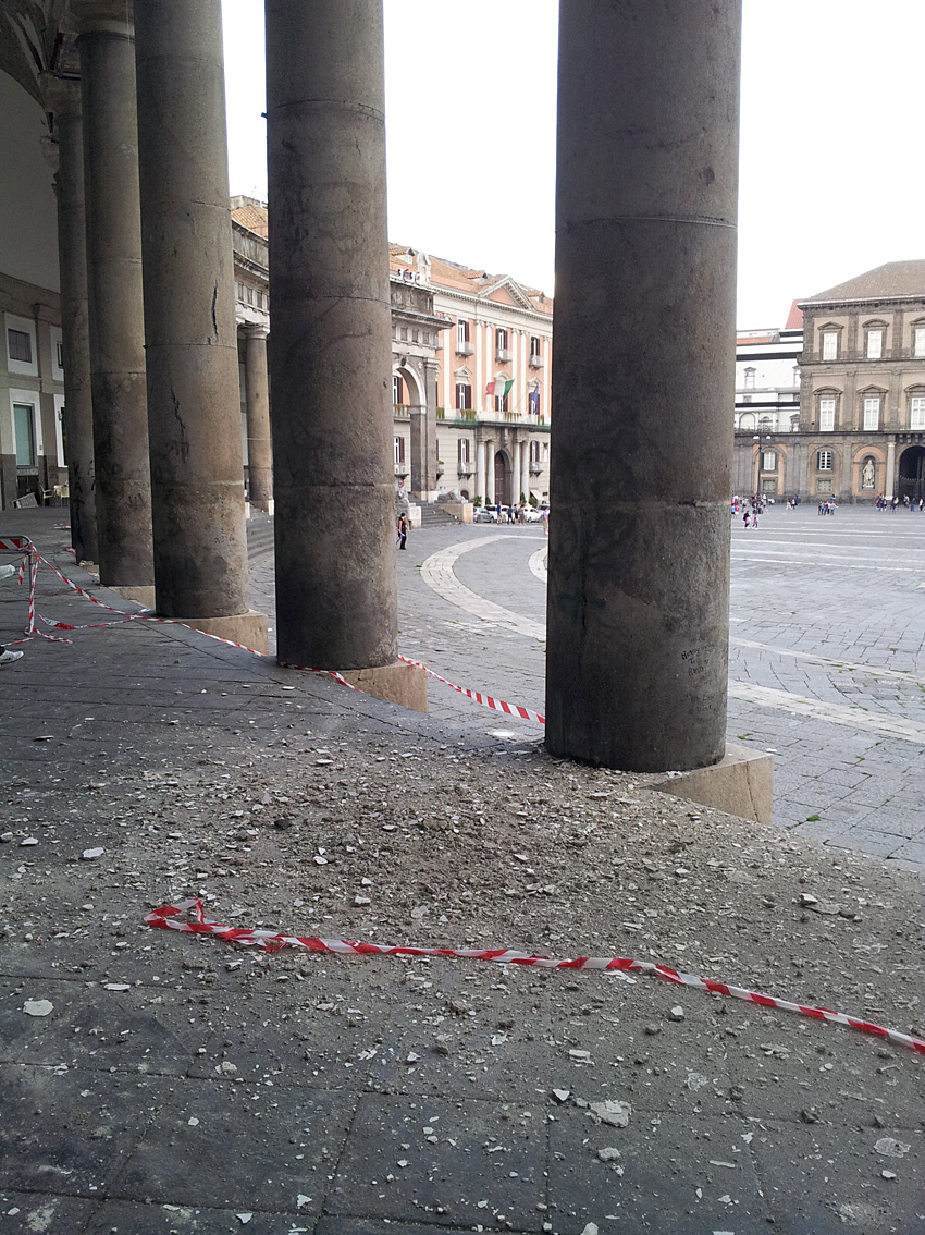 Grida d’allarme inascoltate, conseguenze preannunciate e colonnato transennato, si fa per dire, con nastro di plastica e protezione civile che starebbe per far rimuovere quei pochi tavolini al servizio dei pochi turisti e cittadini che hanno il coraggio di avventurarsi sul posto. E stiamo parlando di un luogo storico, di un monumento di rilevanza internazionale, non certo di una piazzetta qualunque. Ma stavolta diciamo “per fortuna”, perchè non sarebbe bello ritrovarsi sotto una pioggia di intonaco. I detriti sono tutti li.