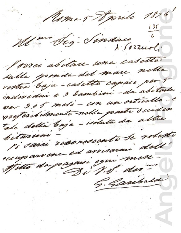 Con una lettera del 5 Aprile 1876 oggi conservata nel Museo del Risorgimento Italiano di Roma, Garibaldi espresse al Sindaco di Pozzuoli Giovanni De Fraja il desiderio di abitare a Baia, in una casa per sé e la sua famiglia. Si era innamorato di un sito che aveva sempre negli occhi e nella mente da quando nell’autunno del 1866 si era affacciato sbalordito dagli spalti del Castello per ammirare l’incanto del golfo cumano.