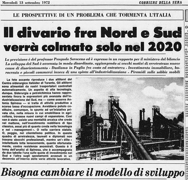 Angelo Forgione – Fa “sorridere” la riesumazione di un articolo del 1972 sul Corriere della Sera che pubblicava la previsione riportata in un rapporto del Ministero del Bilancio circa la chiusura del divario fra Nord e Sud del Paese nel 2020. Era l’Italia da poco uscita dal boom economico, e da allora il divario non solo non è stato minimamente ridotto ma è cresciuto notevolmente. I diplomati ed i laureati continuano ad emigrare; il reddito medio pro-capite al Nord è quasi il doppio di quello del Sud; il tasso di disoccupazione in alcune aree del Mezzogiorno supera il 18%, mentre in tante città settentrionali è meno del 5%.