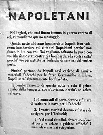 Questa notte abbiamo bombardato Napoli. Non volevamo bombardare voi cittadini Napoletani perché non siamo in lite con voi. Noi vogliamo soltanto la pace con voi. Ma siamo stati costretti a bombardare la vostra città perché voi permettete ai Tedeschi di servirsi del vostro porto.