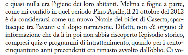 Al di là di Amandola, un’altra grande vittoria è aver diffuso una delle verità storiche sulla cultura napoletana. Decine di migliaia di persone in tutta Italia hanno visto e stanno vedendo la video-denuncia che racconta anche la storia del bidet in Italia (mi scuso per alcuni errori tecnici nel video ma ho dovuto chiudere frettolosamente il filmato senza verificarlo, in perfetto stile TGR Piemonte, ndr); Anna Pettinelli su RDS l’ha divulgata in radio; il TG5 l’ha riportata nell’edizione delle 13:00; Roberto Saviano l’ha ripresa sui social-network e Massimo Gramellini, a “Che tempo che fa”, l’ha ulteriormente rimbalzata in prima serata (nel video), preannunciando tra l’altro con un poco rassicurante tono di sfida “falsocortese” una risposta al collega napoletano. Questa è vera revisione storica moderna che vale più di cento libri sull’argomento e Pino Aprile, con la sua tipica verve, mi ha scritto in una corrispondenza privata che da questo momento in poi il tempo, in italia, va contato come pb o db (prima bidet e dopo bidet).