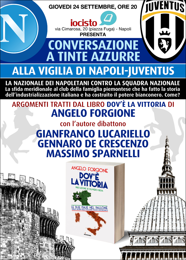 Giovedì 24 settembre, alle ore 20, presso la libreria Iocisto di Napoli, in via Cimarosa 20 (piazza Fuga, adiacente Funicolare centrale) si terrà una “Conversazione a tinte azzurre alla vigilia della partita Napoli-Juventus”.