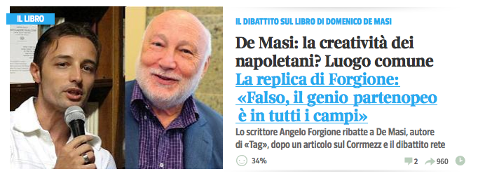 Chiudo con la dichiarazione del filosofo Domenico De Masi, che non si capisce perchè quando si parla di Napoli spunti fuori lui che è nato in provincia di Campobasso, si è laureato a Perugia e vive a Roma. Non perchè ha fatto il liceo a Caserta e ha avuto un ruolo di assistente di sociologia all’Università di Napoli deve essere per forza considerato un pensiero napoletano. De Masi ha chiuso il suo intervento a Repubblica.it dicendo che i napoletani che vogliono un cambiamento vanno via. Ebbene, De Masi non rappresenta lo spirito di Napoli che non rappresenta rassegnazione; e la rassegnazione non rappresenta l’uomo.