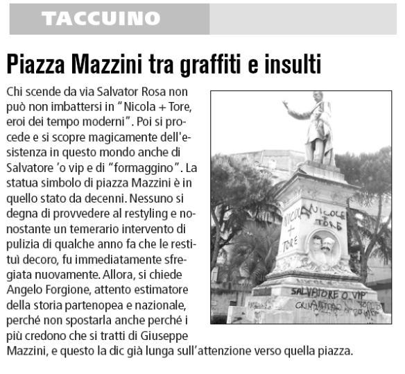 Finalmente si avvia a soluzione l’ANNOSO SCANDALO di Piazza Mazzini al centro della quale, da almeno un decennio, fa “bella” mostra la statua di Paolo Emilio Imbriani sfregiata da scritte in ogni dove. Sta finalmente per sparire la vergogna e il decoro urbano nel sito sta per tornare meno astratto e indefinito.