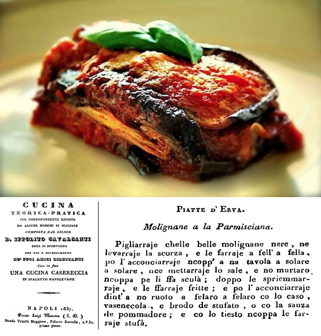 Angelo Forgione – È di Ippolito Cavalcanti, napoletano di Afragola, il primato divulgativo della ricetta della gloriosa Parmigiana di melanzane, altra gloria della cucina napoletana nonostante sulle sue origini vi sia ancora molta confusione. Fu nell’appendice dedicata alla cucina casareccia napoletana della prima edizione della Cucina teorico-pratica, quella del 1837, che spuntò la preparazione delle “Molignane a la Parmisciana”, tradotta in italiano (“Milinsane alla parmigiana”) sette anni dopo nella quarta edizione del trattato, quella del 1844.