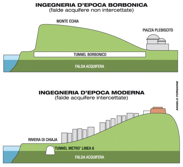 Evidentemente, il sottosuolo di Napoli è pieno di cave di tufo e trafori, ma nonostante da circa 150 anni esista il tunnel di Alvino, non si sono mai registrati problemi di staticità degli edifici sovrastanti. Di grandi problemi, l’architetto borbonico ne trovò ma tutti furono risolti brillantemente con soluzioni a regola d’arte, compresi dei lavori idraulici per consentire il passaggio dell’acqua dell’antica “Bolla” a quote inferiori rispetto a quella della galleria. Soprattutto, il tunnel fu realizzato tenendo conto delle falde acquifere, cioè al di sopra e senza intercettarle. Tutto il contrario della galleria del metrò che di falde acquifere ne ha intercettate ben tre. E i risultati sono sotto gli occhi del mondo intero. È interessante notare che la visita all’originale percorso borbonico può deviare accedendo al traforo della “Linea Tranviaria Rapida”, scavato in occasione dei mondiali di Italia 90 e realizzato con l’impiego di cospicui fondi statali, con l’intento di collegare Piazza del Plebiscito con Fuorigrotta. Ebbene, quel progettò fallì perché intercettò la falda acquifera. Ora ci risiamo, mentre a quelli lì continuano a chiamarli retrogradi borbonici.