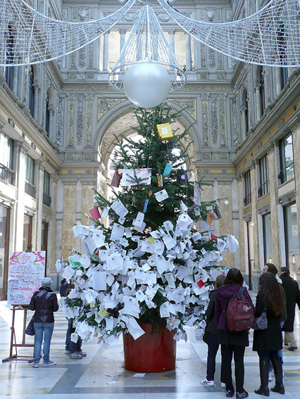 Angelo Forgione – Piazzato e subito rubato il tradizionale albero di Natale della Galleria Umberto I di Napoli, sul quale i napoletani appendono i classici “auspici” per Babbo Natale. Il pino è durato fino alle 23.30, orario intorno al quale è stato portato via dalla solita banda di scugnizzi dei quartieri spagnoli. Le telecamere a circuito chiuso dei negozi hanno ripreso un gruppo di una decina di ragazzini che si sono arrampicati fino alla cima dell’albero per tagliare i fili di ancoraggio, rovesciandolo, per poi trascinarlo via. L’albero è stato ritrovato in mattinata al vico Tofa. Una triste tradizione che torna dopo qualche anno di pausa. E un motivo c’è!