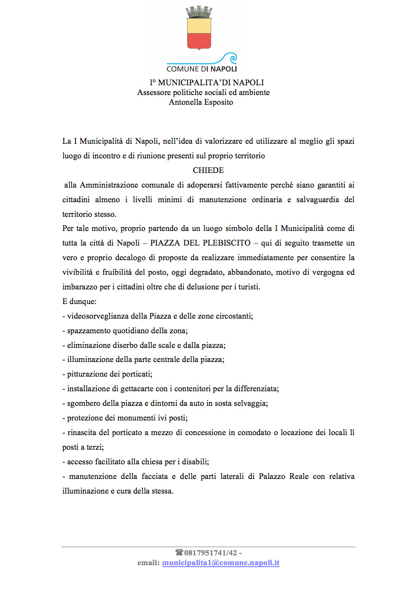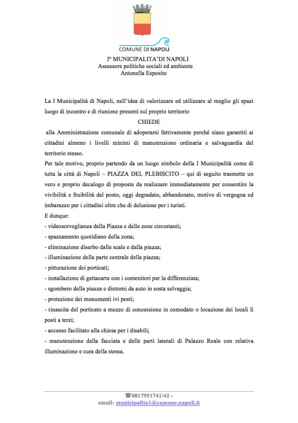 A seguito dell’incontro avuto con l’Assessore alle politiche sociali della Municipalità I Antonella Esposito tenutosi il 12 Marzo scorso circa le condizioni di degrado di Piazza del Plebiscito, ecco quanto formulato in richiesta al Comune di Napoli.