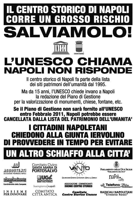 La denuncia arriva da Alberto Patruno e Gianfranco Wurzburger, rispettivamente presidente e assessore alla vivibilità della II Municipalità di Napoli che comprende gran parte del centro storico in cui si legge anche che “un protocollo d’intesa tra Comune di Napoli, Regione Campania, Soprintendenza e Curia Arcivescovile, totalmente ignorato dal presidente Caldoro, è stato cestinato senza alcun rispetto per chi vive il centro storico!”.