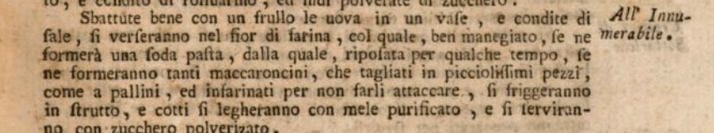 Nel 1694, Antonio Latini, cuoco di origini marchigiane con grande esperienza di lavoro a Napoli, pubblicò nella città partenopea il suo trattato Lo scalco alla moderna, in cui propose la preparazione della “Pasta di Strufoli, alla Romana”.