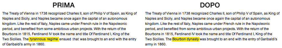 Dunque, anche l’UNESCO mostrava di essere vittima di una certa retorica risorgimentale stereotipata. V.A.N.T.O. ha quindi provveduto a chiedere una correzione al testo che è stata approvata e prontamente apportata, senza alcuna opposizione e con estrema cortesia da parte dei responsabili dell’Organizzazione Culturale Internazionale, quella che manca quando simili situazioni vengono sottoposte all’interno dei confini italiani. Ora la pagina del Centro storico di Napoli riporta nella descrizione storica che The Bourbon dynasty was brought to an end with the entry of Garibaldi’s army in 1860″, cioè semplicemente che “la dinastia borbonica finì con l’entrata dell’esercito di Garibaldi nel 1860”. E così anche nella versione in francese.