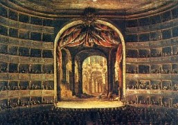 Angelo Carasale che quel giorno si presentò con un aspetto completamente diverso da come lo conosciamo oggi: la sala era in stile rococò (vedi dipinto a destra) e aveva un ingresso a portale sul corpo di fabbrica laterale del vecchio palazzo reale, anch’esso ancora nelle vecchie sembianze del periodo vicerale. Solo 41 anni più tardi, l’architetto Giuseppe Piermarini, allievo di Luigi Vanvitelli a Napoli, avrebbe portato la sua esperienza napoletana a Milano e avrebbe inaugurato il Teatro “Alla Scala”,