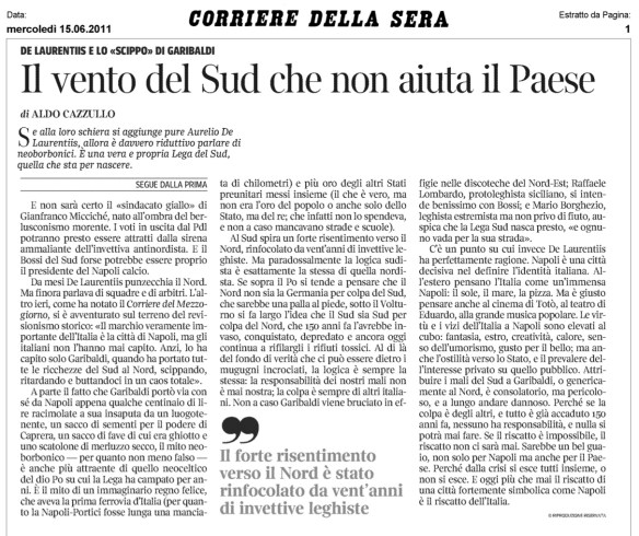 L’avevamo detto, le frasi revisioniste di De Laurentiis avrebbero innescato una reazione a catena. Anche Aldo Cazzullo, noto giornalista piemontese, ha ritenuto di dover dire la sua in merito alle affermazioni su Garibaldi di Aurelio De Laurentiis. Lo ha fatto sul Corriere della Sera (in basso) su cui oggi ha scritto: “Se alla loro schiera si aggiunge pure Aurelio De Laurentiis, allora è davvero riduttivo parlare di neoborbonici. È una vera e propria Lega del Sud quella che sta per nascere”.