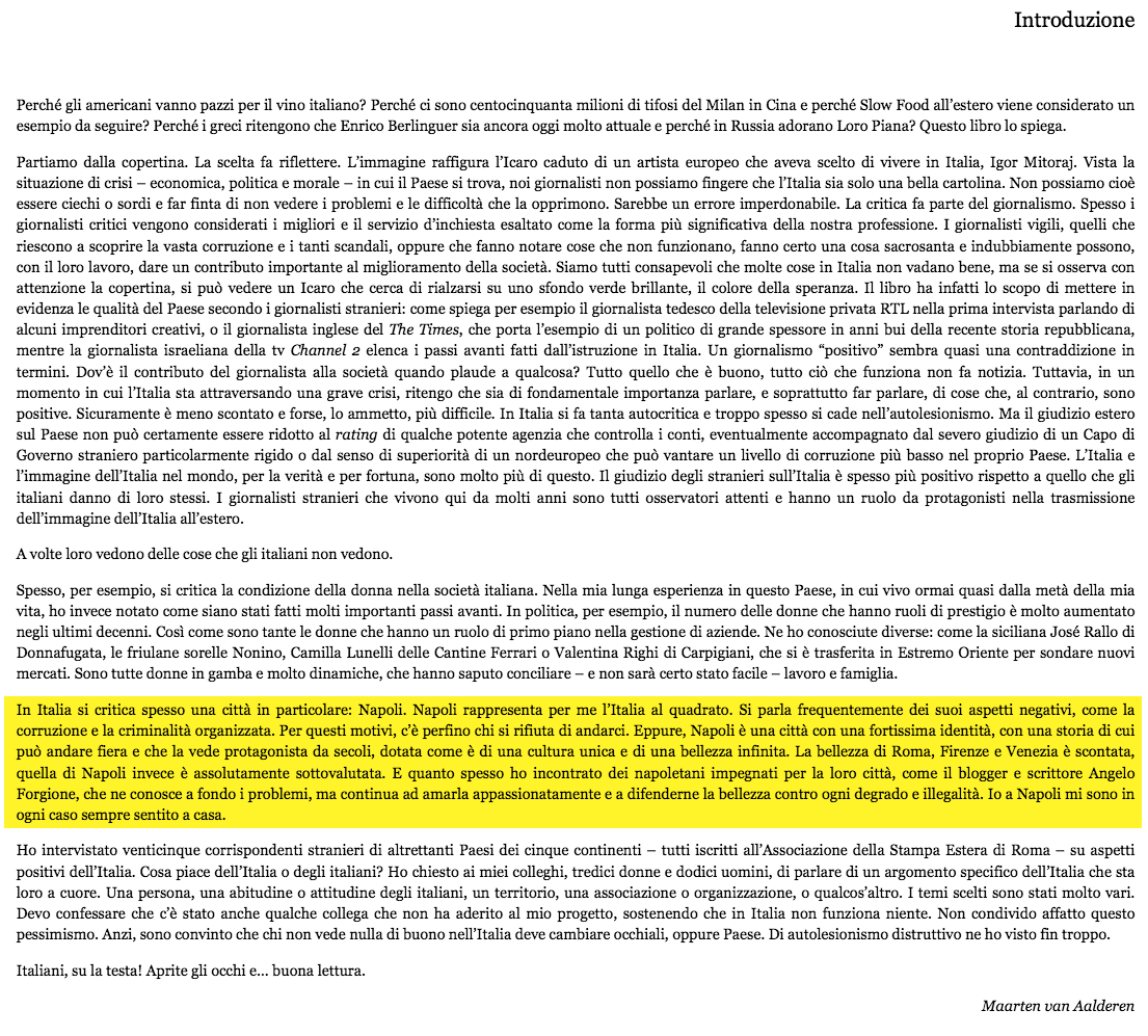 “In Italia si critica spesso una città in particolare: Napoli. Napoli rappresenta per me l’Italia al quadrato. Si parla frequentemente dei suoi aspetti negativi, come la corruzione e la criminalità organizzata. Per questi motivi, c’è perfino chi si rifiuta di andarci. Eppure, Napoli è una città con una fortissima identità, con una storia di cui può andare fiera e che la vede protagonista da secoli, dotata come è di una cultura unica e di una bellezza infinita. La bellezza di Roma, Firenze e Venezia è scontata, quella di Napoli invece è assolutamente sottovalutata. E quanto spesso ho incontrato dei napoletani impegnati per la loro città, come il blogger e scrittore Angelo Forgione, che ne conosce a fondo i problemi, ma continua ad amarla appassionatamente e a difenderne la bellezza contro ogni degrado e illegalità. Io a Napoli mi sono in ogni caso sempre sentito a casa”.