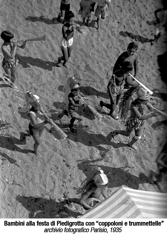 La “trummettella” è descritta nelle testimonianze dell’epoca come “un cono di latta grossolanamente dipinto che emette una sola stridula nota” e la si può vedere in alcune fotografie della “Piedigrotta” di inizio secolo (nella foto, archivio fotografico Parisio).