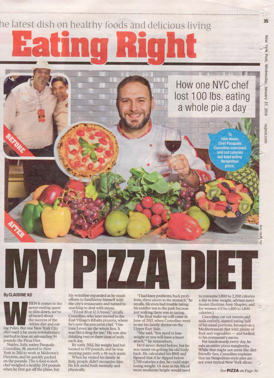 Angelo Forgione – Pasquale Cozzolino, executive chef partenopeo del ristorante Ribalta di New York, non sforna solo le migliori pizze napoletane STG nella “grande mela” ma dimostra ai newyorkesi che la cucina di Napoli è anche genuina e salutare. Con una dieta iniziata lo scorso settembre, ha perso tutti i chili acquisiti negli States, dopo il suo trasferimento da Napoli nel 2011. Era nel suo peso forma, ma per comprendere la ristorazione americana ha dovuto mangiare di tutto, compreso snack e bibite gassate, e ha messo molti chili di troppo, a tal punto da spaventare i parenti quando è tornato a visitarli in Italia. Ha iniziato ad avere problemi alle ginocchia, alla schiena e pure allo stomaco. Quando il suo medico americano gli ha detto che rischiava seri problemi cardiaci, ci ha dato un taglio, ha ricominciato a mangiare alla mediterranea e ha ripreso il suo peso ideale, perdendo 45 chili. Sperimentata su di sé una nuova dieta: una pizza napoletana al giorno, per cinque giorni a settimana; verdure e frutta senza limiti. Il tutto, condito dall’esercizio fisico. Spariti i dolori e i problemi allo stomaco, forma fisica appagante e vita migliorata, grazie alla dieta mediterranea, che proprio l’americano Ancel Keys codificò sull’alimentazione dei napoletani negli anni Cinquanta, quando le mode americane non avevano ancora inquinato lo stile alimentare partenopeo. Ma Cozzolino, con pizza-diet, è fiero anche di aver dato una lezione agli statunitensi, sempre più sensibilizzati circa la differenza tra la pizza made in USA, considerata junk-food, cibo spazzatura, e la pizza made in Naples, genuina, sulla quale si può impostare una sana alimentazione, poiché non contiene grassi aggiunti e il suo impasto, frutto di lunghe e naturali lievitazione, è altamente digeribile. E ora la stampa di New York racconta la sua esperienza, che fa da monito anche al popolo napoletano, paradossalmente il più affetto da obesità in Italia. Se lo sapesse Ancel Keys…